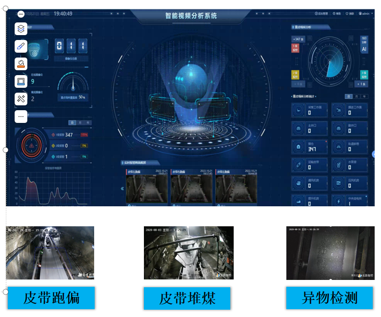车集煤矿,产能力280万吨,在皮带机机头、机尾、主井、副井、井下车场等位置实现人员不带安全帽、离岗、皮带异物、皮带堆煤、皮带跑偏、跨越皮带等15个AI视频智能分析模型场景的实时智能分析。