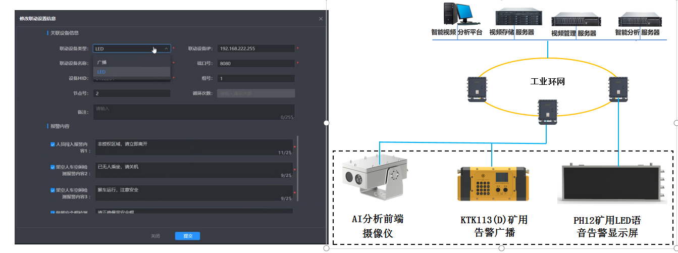 可通过视频AI分析平台,直接联动井下LED广播、井下LED联动告警屏幕,实现人员违章现场执法与警示,实现设设备现场运行实时提醒。