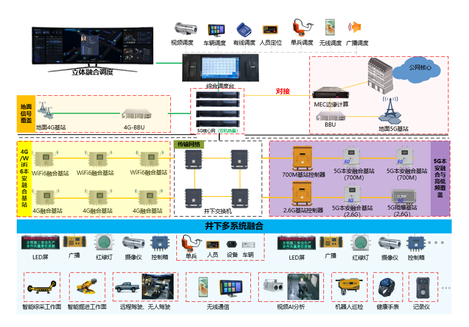 工作面设备汇集点高频大带宽覆盖 大巷、顺槽、变电所低频长距离覆盖 高频基站具有高带宽、低时延的特性,在变电所、工作面用高频站,保证大带宽、低延时,实现机器人、高清视频成像要求 低频5G基站具有覆盖能力强、组网成本低、信号绕射和穿透能力强、信号传输效率高等优势,解决广覆盖,车辆定位、车辆通信、红绿灯的多融合。 低频+高频混合频段组网,解决在煤矿采掘工作面、拐弯、上山/下山、起伏、死角等复杂场景下覆盖问题。