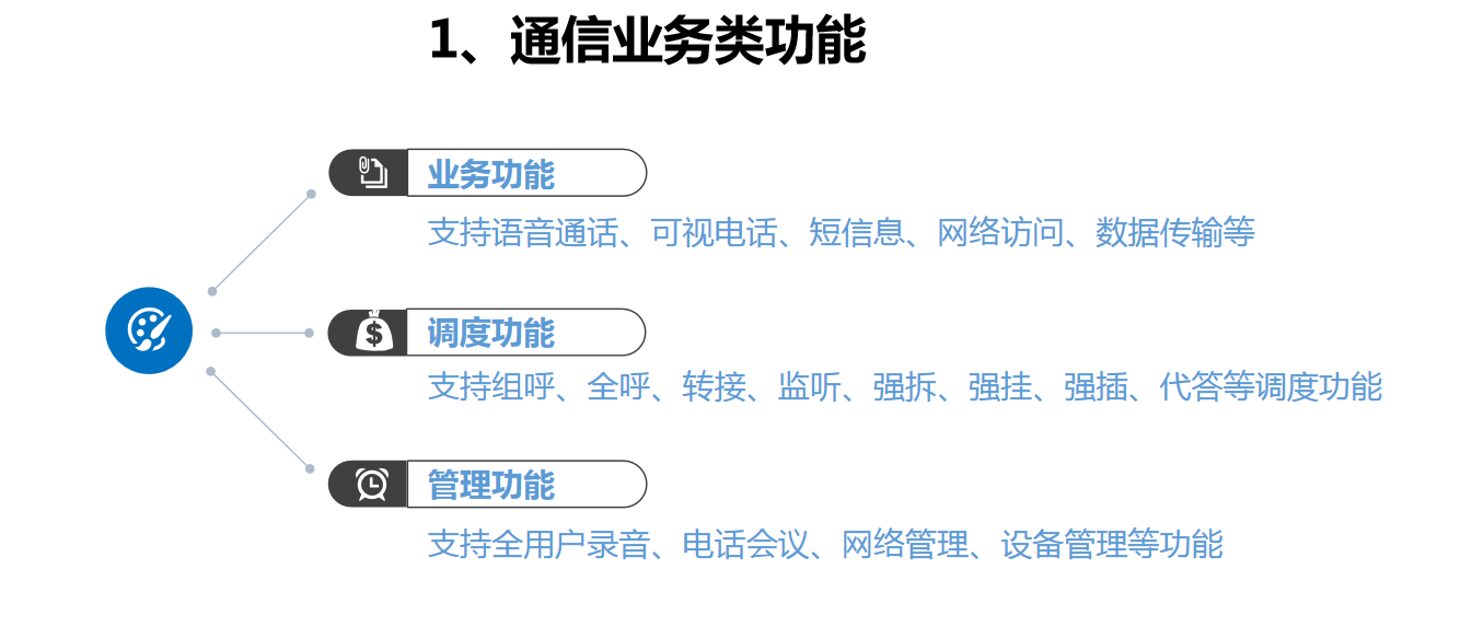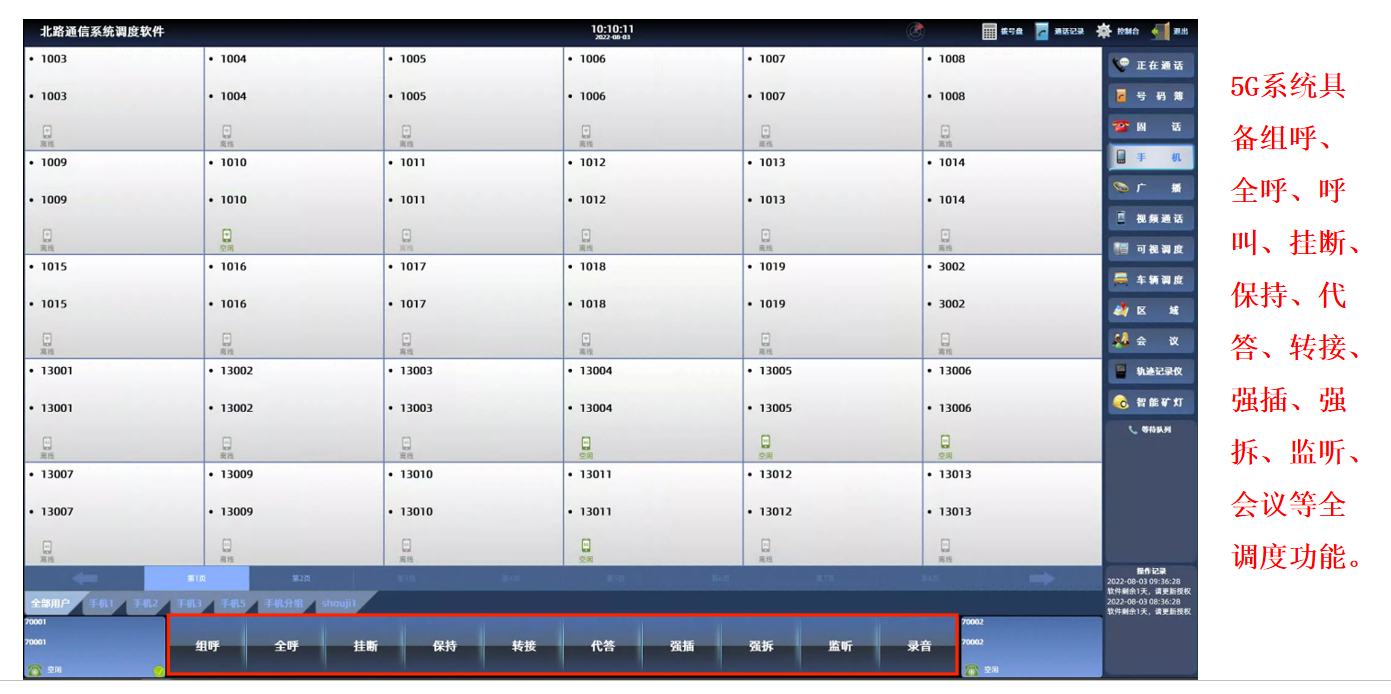 5G系统具备组呼、全呼、呼叫、挂断、保持、代答、转接、强插、强拆、监听、会议等全调度功能。